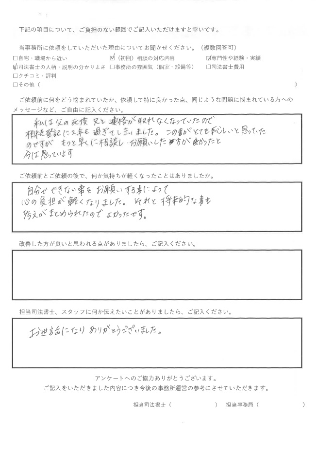 S様には関係が疎遠な相続人がおられたため、その方が手続きに協力してくれるか不安に思われていましたが、司法書士が中立の立場で今回の手続きについてご説明することで、ご納得いただき、スムーズに手続きを完了することができました。その結果、S様の心の負担を軽くすることができて本当に良かったです。