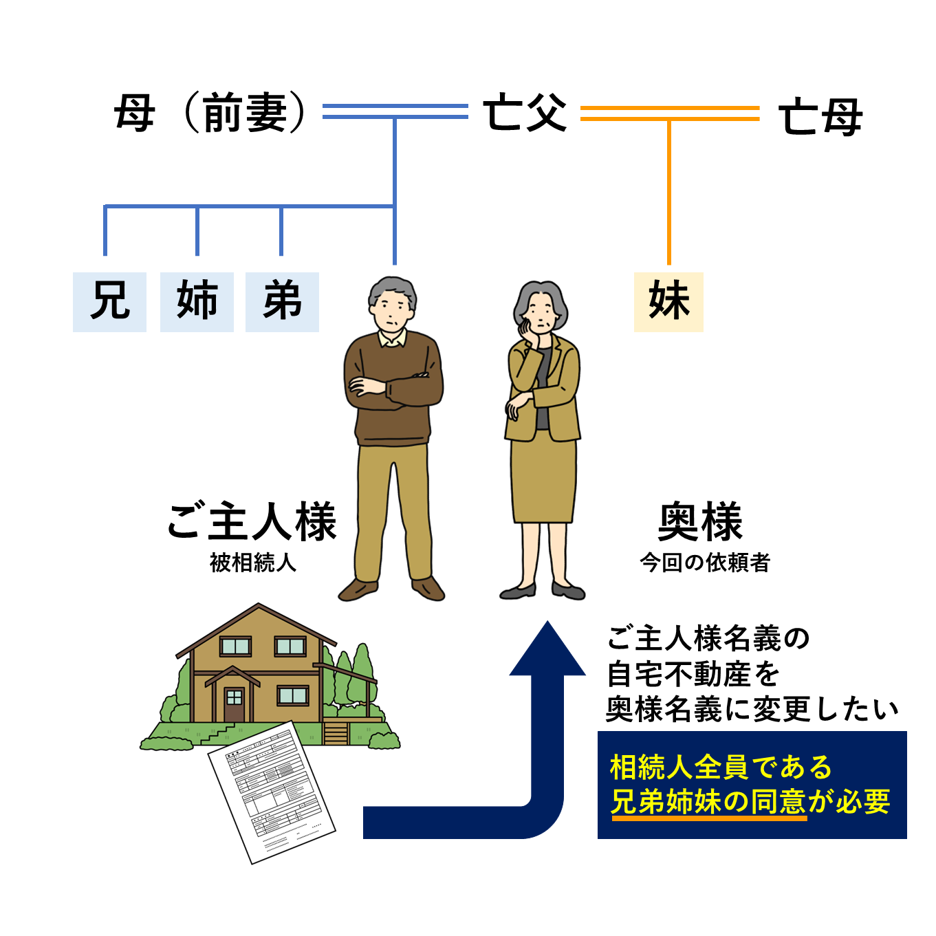 Bさんはなるべく速やかに自宅の名義を変更したい意向でしたが、今回は兄弟姉妹も奥様とおなじく相続人となります。